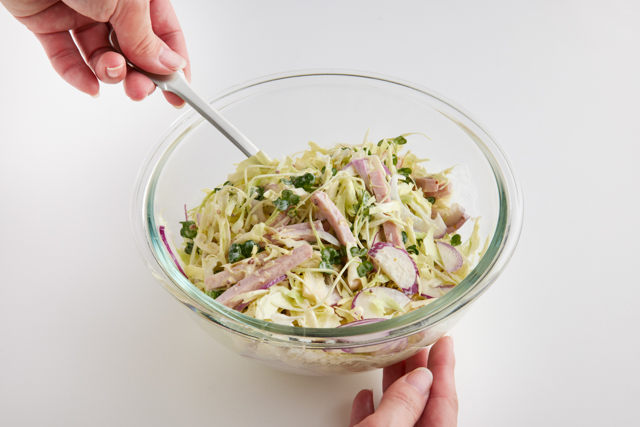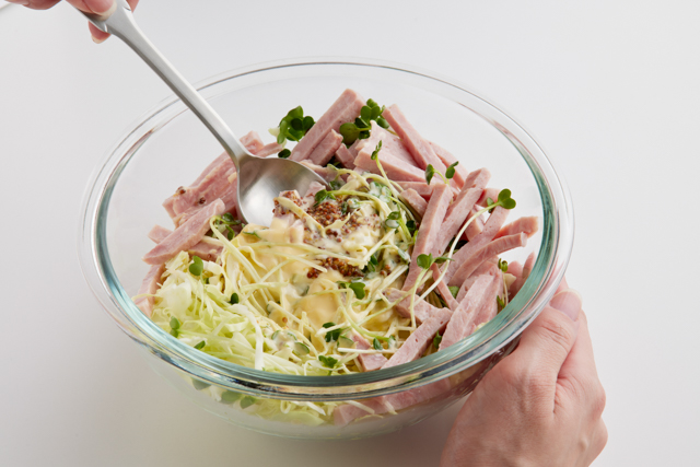 ハム、キャベツ、赤たまねぎは千切りに、かいわれは根元を切る。